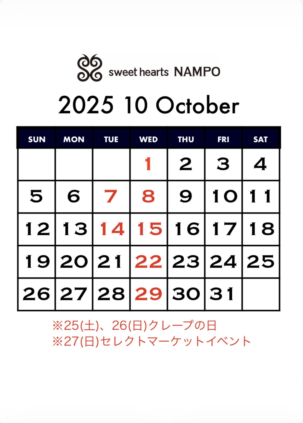 10月の定休日です。